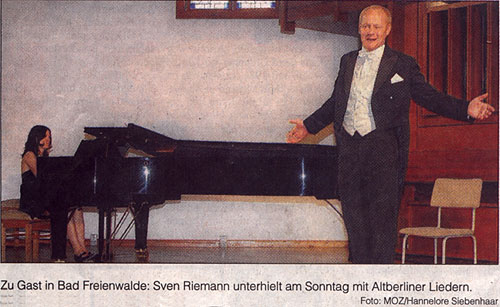 Der Einladung zu einem Liederabend in de Aula der Grundschule “Otto Lilienthal” Wustermark folgten kürzlich mehr als 100 Gäste. Der Künstler Sven Riemann trug Alt-berliner Lieder und Texte voller Witz und tiefgründiger Lebensweisheit gekonnt vor. Begleitet von seiner schwungvoll spielenden Pianistin Alina Pronina zauberte Riemann in rasantem Tempo das alte Berlin auf die Bühne. Dabei brachte er z.B. Otto Reutter, Kurt Tucholsky, Theodor Fontane oder Claire Waldoff zu Gehör.