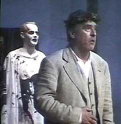 ... Facettenreich setzt Andreas Schmidt-Schaller die Titelrolle mit dem allegorischen Namen um: In kaltherziger Banker-Manier tritt er dem armen Nachbarn und den Schuldknechten gegenüber; selbstgerecht sieht er sich als verdienter und unangreifbarer Herr über Geld und andere Menschen; unter Qualen gelangt er zur Einsicht, daß er die letzte Reise allein antreten muß und nur seine “guten Werke” noch für ihn sprechen können; vom Lippenbekenntnis gerät ihm die Rückkehr zum Glauben schließlich zu ehrlicher Besinnung. Handfest und unprätentiös agiert Gottfried Richter als Jedermanns guter Gesell, glaubwürdig Winfried Wenzel als armer Nachbar, angenehm ironisierenden Habitus geben Uwe Dreves und Jürgen Kern den beiden Vettern. Ohne falsche Sentimentalität, deshalb um so eindringlicher gibt Astrid Bless die Rolle der mahnenden Mutter, die durch eine weitere Besetzung als Glaube einen sinnreichen Hintergrund erhält. Ähnlich, wenn auch nicht so vordergründig läßt sich die Doppelrolle von Andrea Aust als Buhlschaft und als gute Werke sehen. Sowieso gilt das für Sven Riemann als Tod und Teufel. Vor allem letzteren - den zweifellos dankbaren Part des um die sichere “Beute” betrogenen Höllenfürsten - spielt der einstige Rostocker zum Vergnügen des Publikums in himmlischer Empörung, die weder des ernsthaften Appells an das irdische Gerechtigkeitsempfinden noch des Spaßes am Spiel entbehrt...
